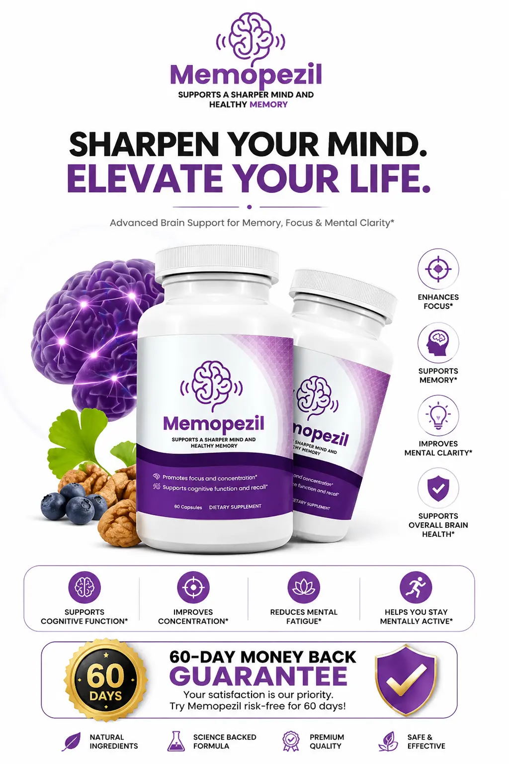 MemoPezil is a modern cognitive support formula designed for those who want to stay mentally sharp, focused, and clear throughout the day. It helps support memory function, concentration, and consistent brain energy—while being carefully crafted in the USA and backed by a 60-day money-back guarantee for complete peace of mind.
